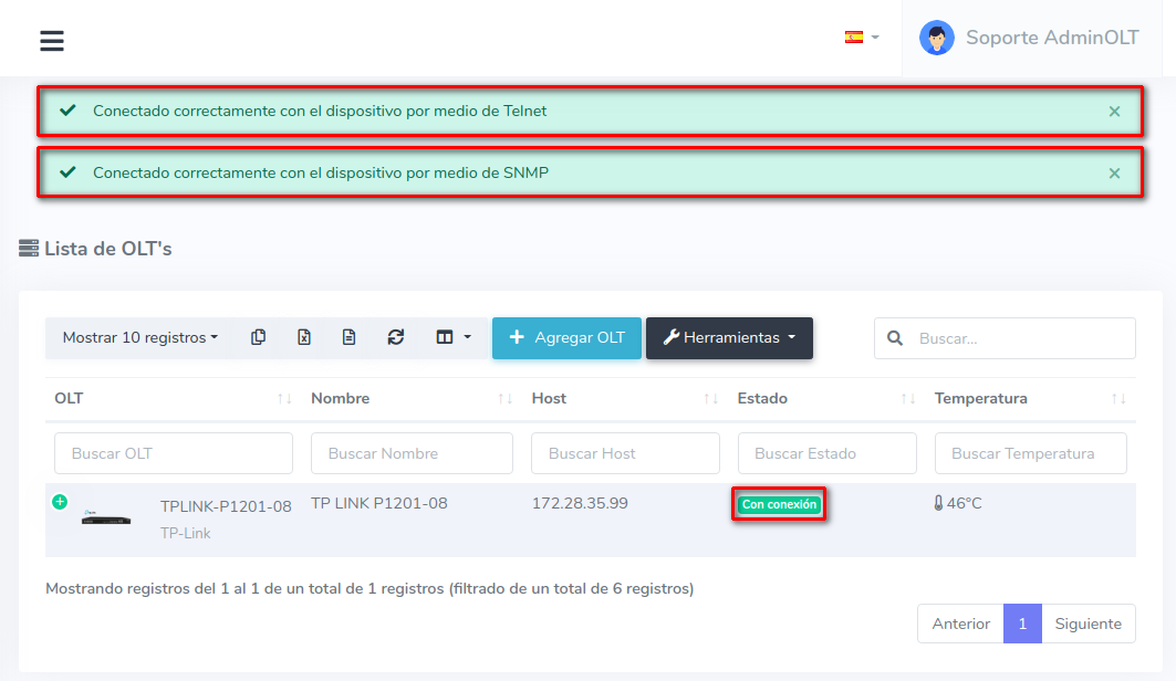 5 Verificar la conexión de su OLT en AdminOLT (en caso de que no haya conexión por SNMP es porque su OLT aún no cuenta con las configuraciones iniciales).