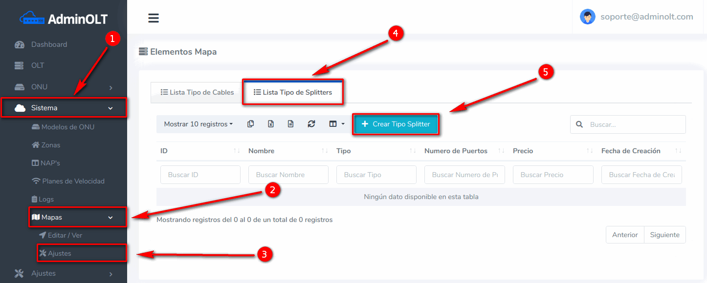 1 Ir a la sección Sistema > Mapas > Ajustes > Lista de Tipos de Splitters