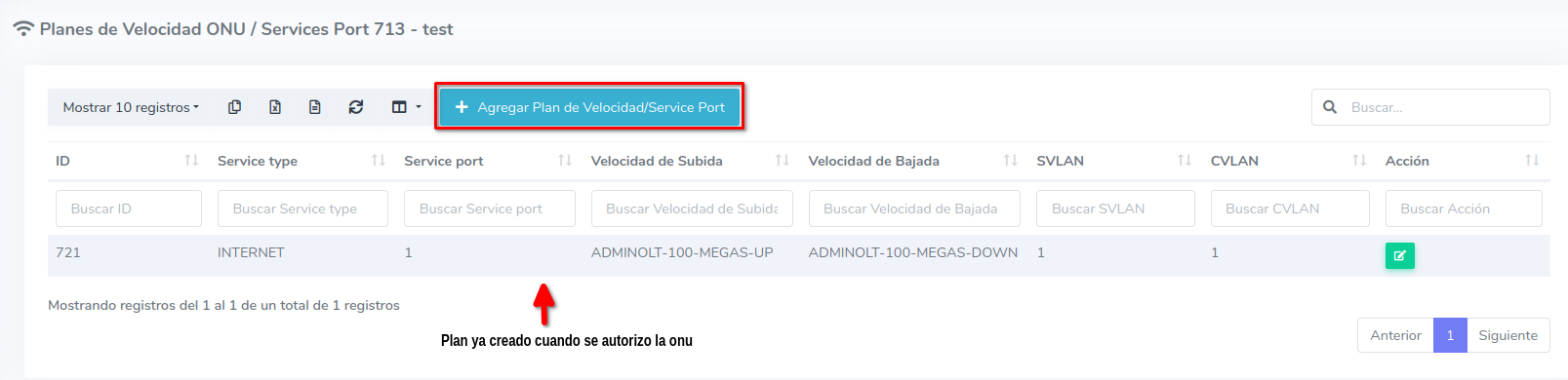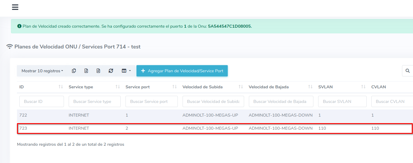 El nuevo plan de velocidad se mostrara en el listado de planes de velocidad