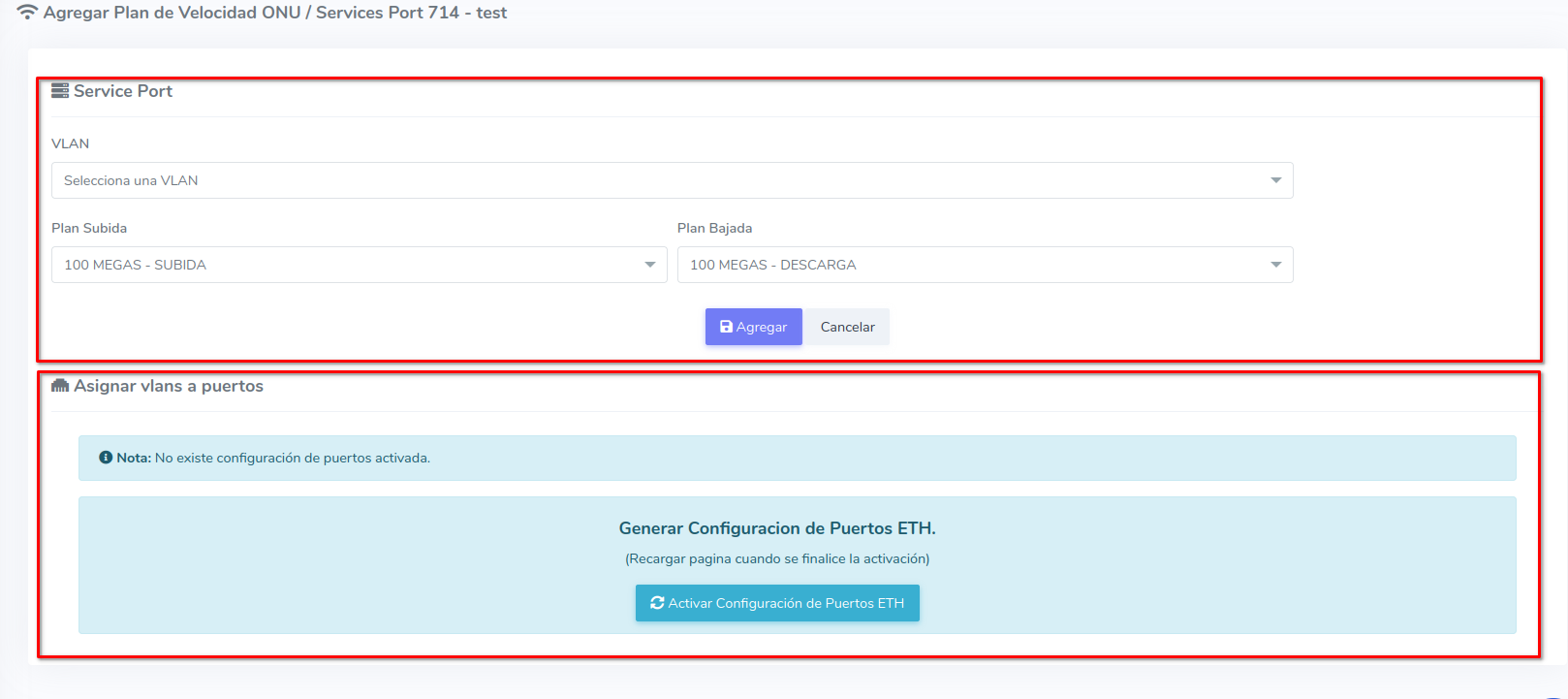 2.1 Dar clic en Agregar Plan de velocidad/Service Port.
