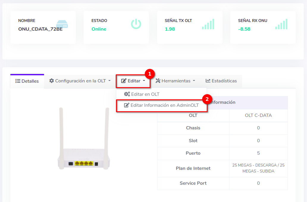 - Editar ONU en AdminOLT desde Detalles de ONU