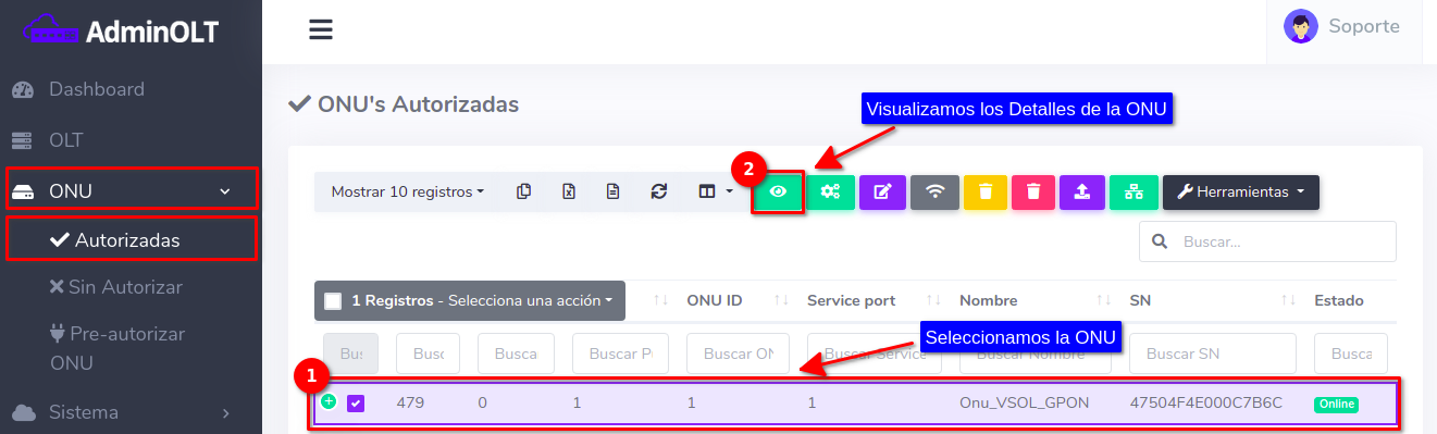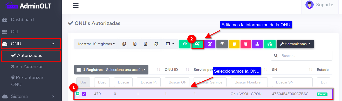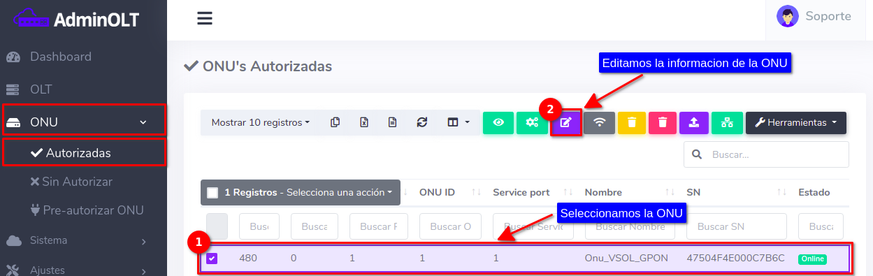 Pasos para editar información de ONU Autorizada en AdminOLT