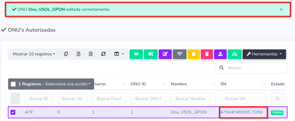 En AdminOLT podemos editar información de una ONU Autorizada en la OLT, supongamos que alguna de las ONUs que tenemos autorizadas en el sistema se estropea. Tomaremos como ejemplo esta situacion para explicar el propósito de esta función. Asi que en ese caso en AdminOLT al editar ONU por SN podemos tomar información de alguna ONU no Autorizada y usarla, sin perder la configuración inicial que teníamos.