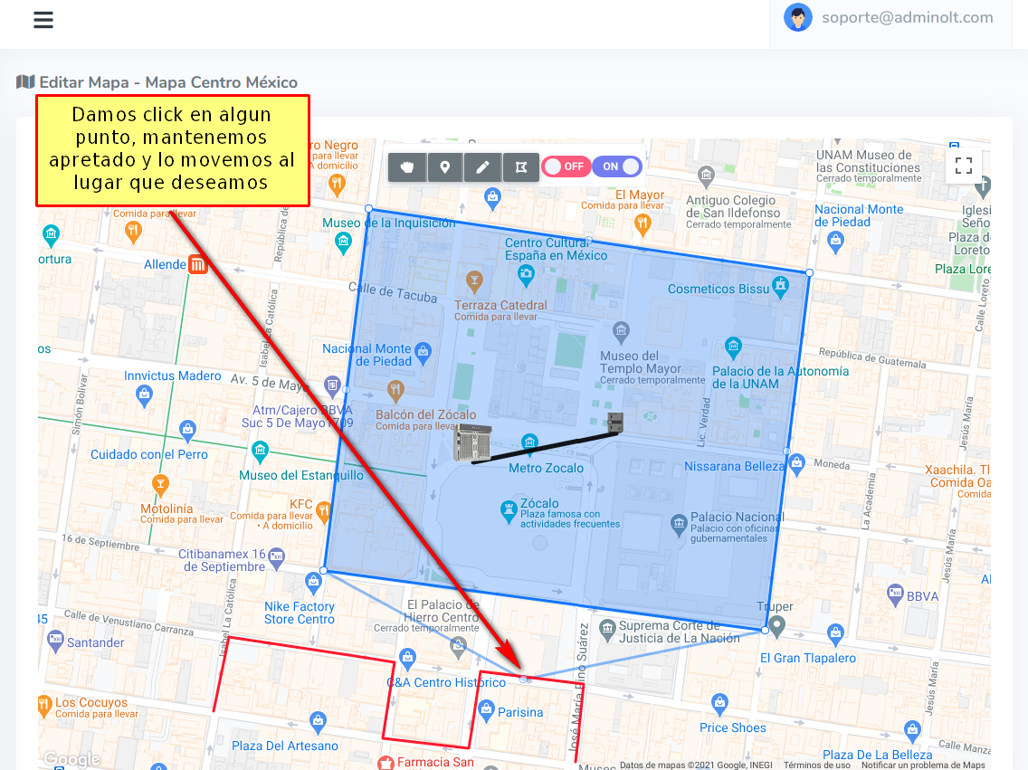 Una vez haya dibujado la Geozona que desea, para terminar de dibujar debemos dar click en la opción de Manipular Mapa.