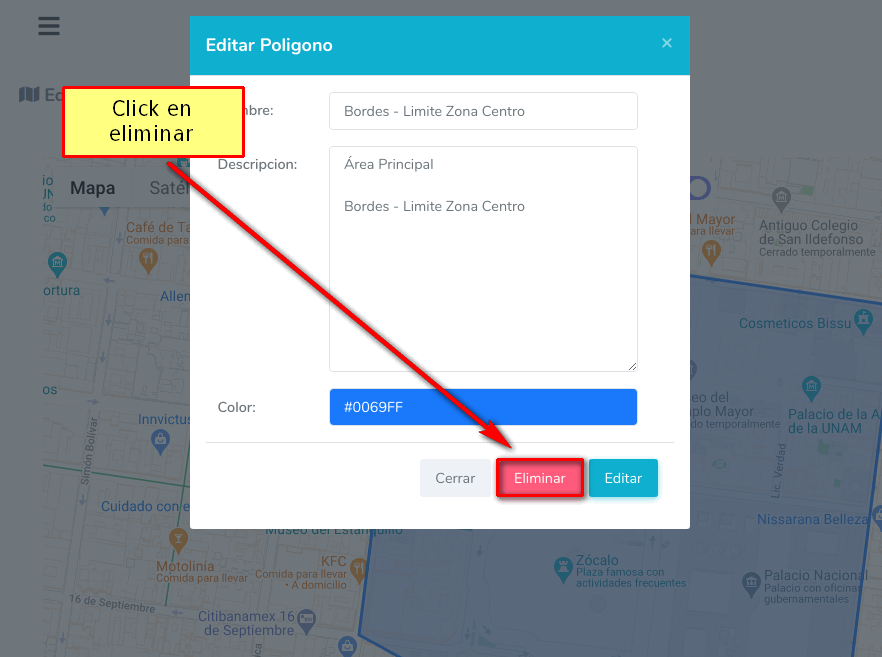 Para dibujar nuestra Geozona damos click en los puntos que deseamos.