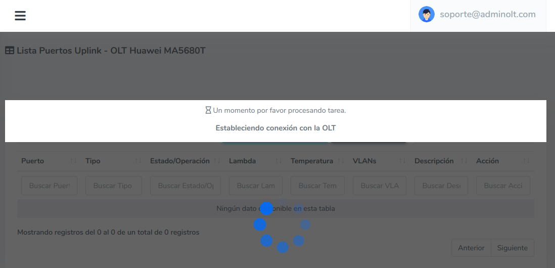 2Una vez entrando nos saldrá una ventana que nos indica que se están consultando los puertos uplink de la OLT