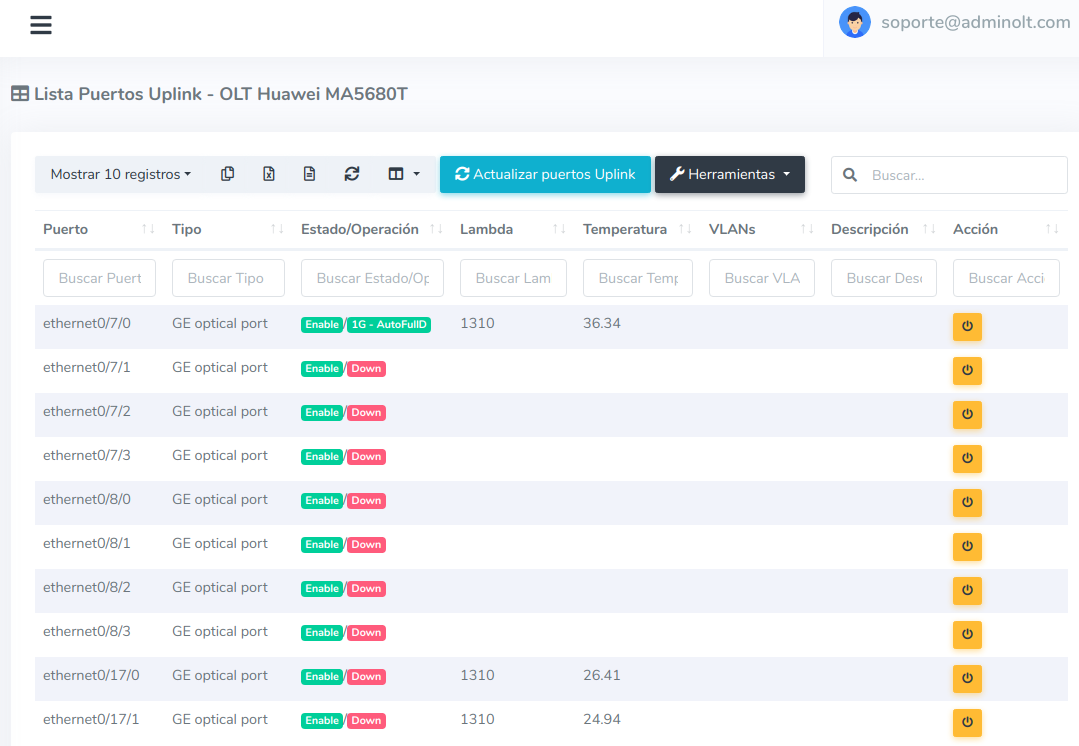 Si su OLT es nuevo y el modelo es Huawei MA5800, es necesario que baje la velocidad del puerto Uplink que utiliza para salida a Internet a 1GB.