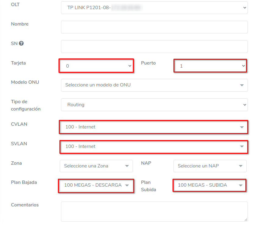 Es necesario que como primer paso sea seleccionar la OLT donde se realizara la acción. Al momento de seleccionar alguna OLT, se autocompletarán algunos datos del formulario, por ejemplo Tarjetas, Puertos o VLAN.